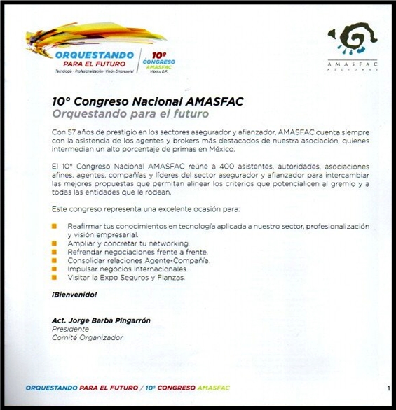 10º Congreso AMASFAC. México D.F. – 10 y 11 de Marzo de 2016. AMASFAC – Asociación Mexicana de Agentes de Seguros y Fianzas A. C. México. Programa del Evento.